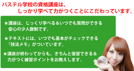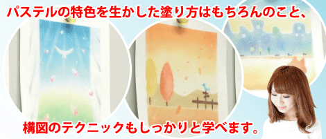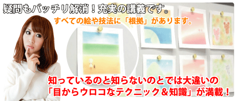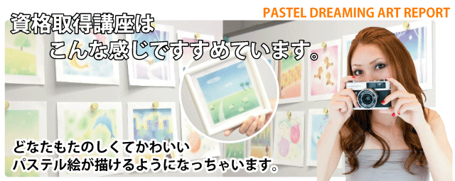 このページでは、パステル学校のインストラクターコースを例にとって パステルドリーミングアートの資格取得講座の流れを紹介していきます。 ちなみに、このページのパステル絵は、すべて受講された方の絵です。 パステル学校の資格取得講座では、実際の教室で人気の図案を使って、 50以上の技法を体感しながら学んでいきます。 講座では、絵の描き方だけでなく、 ・この絵のポイントは何か ・塗り方のテクニック ・なぜこのような構図になっているのか ・色づかいの効果 ・教える際のポイント ・アレンジする場合は、どういった点に着目するか といったことを学んでいきます。 まず何はともあれ、お手本の図案をもとに、一緒に絵を描いていきます。 絵を1枚描き終わった後は、重要な点の講義に入ります。 ここでは、主に、絵の知識や考え方、これからの練習ポイントを学んでいきます。 絵の得意苦手は関係なく、どなたもしっかりと学べるよう板書を交えながら わかりやすく 丁寧に講義しています。 パステル学校では、どれだけシンプルな絵柄でも、ただ漠然と「自由に描きましょう」だとか 「そのあたりは感覚で描いてOK」といったあいまいな指導は一切ありません、 ・自由に描ける部分がある絵は「なぜ自由に描いても絵が成り立つのか」 という点もしっかりと説明していきますので、 いざ教える立場になった時も安心です。 1枚の絵を描き終わるごとにホワイトボードに貼り出していきます。 そうして次の絵に入っていきます。 1枚描くごとに、あらたな技法と知識が学べますので、 講座のはじめと終わりとではずいぶんと絵が変わってきます。 特に顕著なのは「色変化」です。 パステル学校独自のグラデーション技法によって、絵の枚数を重ねるごとに どなたもどんどんとグラデーションが美しくなっていきます。 講座はこんな流れですすめています。 きちんと学べて力がつくパステル学校の資格取得講座。 パステルを心から楽しんでみたい、伝えたい方の受講をお待ちしています。 >>資格講座について くわしくはこちら